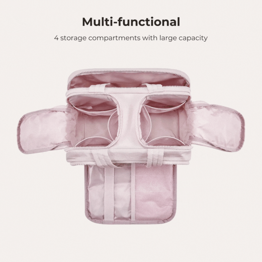 Features four thoughtfully designed compartments with generous storage space. Easily fits all your essentials: skincare, toiletries, cosmetics, travel meds, and more, keeping everything neatly arranged.