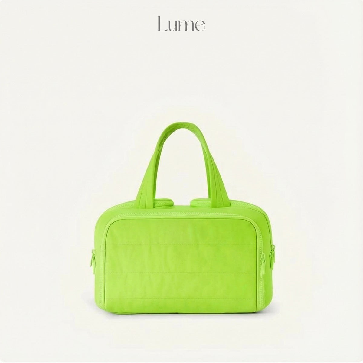 The Lume Toiletry Bag can hold up to 10-15 different items depending on size. It’s perfect for a variety of bottles, tubes, and brushes!